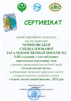 Щиро дякуємо за зелені подарунки в якості лікарських рослин та СЕРТИФІКАТ від Чернігівської обласної організації Українського товаривства охорони природи, який засвідчує, що на території СЗОШ№2 І-ІІІ ступенів з поглибленим вивченням іноземних мов у рамках проведеної екологічної акції "Зелені легені міста", здобувачами загальної середньої освіти створено еколого-освітню стежку " Зелені легені нашої школи" ( 2021р.)
